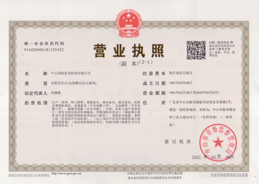 地址:廣東省中山市板芙鎮芙蓉路2號(中山四海家具制造有限公司)
